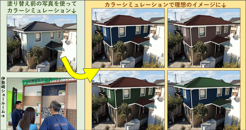 どんなお家でも一瞬でイメージを変えてしまう「色選び」良くも悪くも色選びというのは、非常に難しいものです。だからこそ、できる限り仕上がりをイメージできるように、「カラーシミュレーション」が非常に有効です。弊社では大切なお客様がしっかりとご納得していただける色を選べるように、塗装工事の経験のある弊社のプランナーと色を決めていくのでご安心ください。
