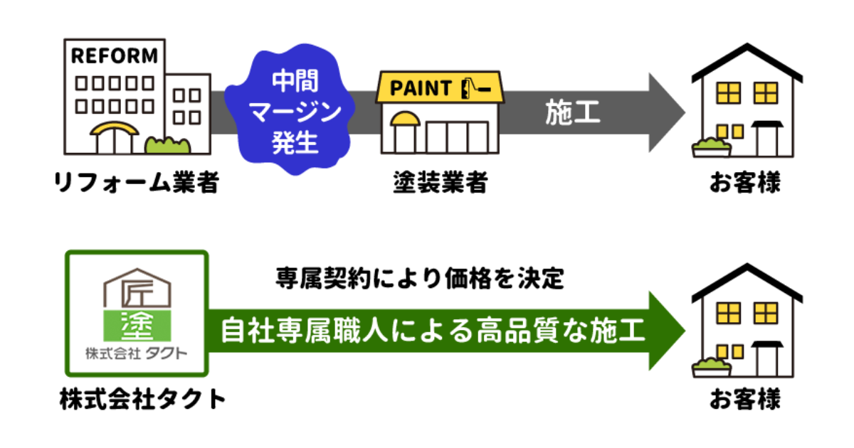 タクトは関東エリアで初のドローンによる住宅診断を行った会社でもあります。専門家による徹底した調査のもと、そのお宅に合った塗装仕様・方法・塗料を決定いたします。また、お見積もりはご予算に合わせて数プランご提案させていただきますので、ご安心ください。