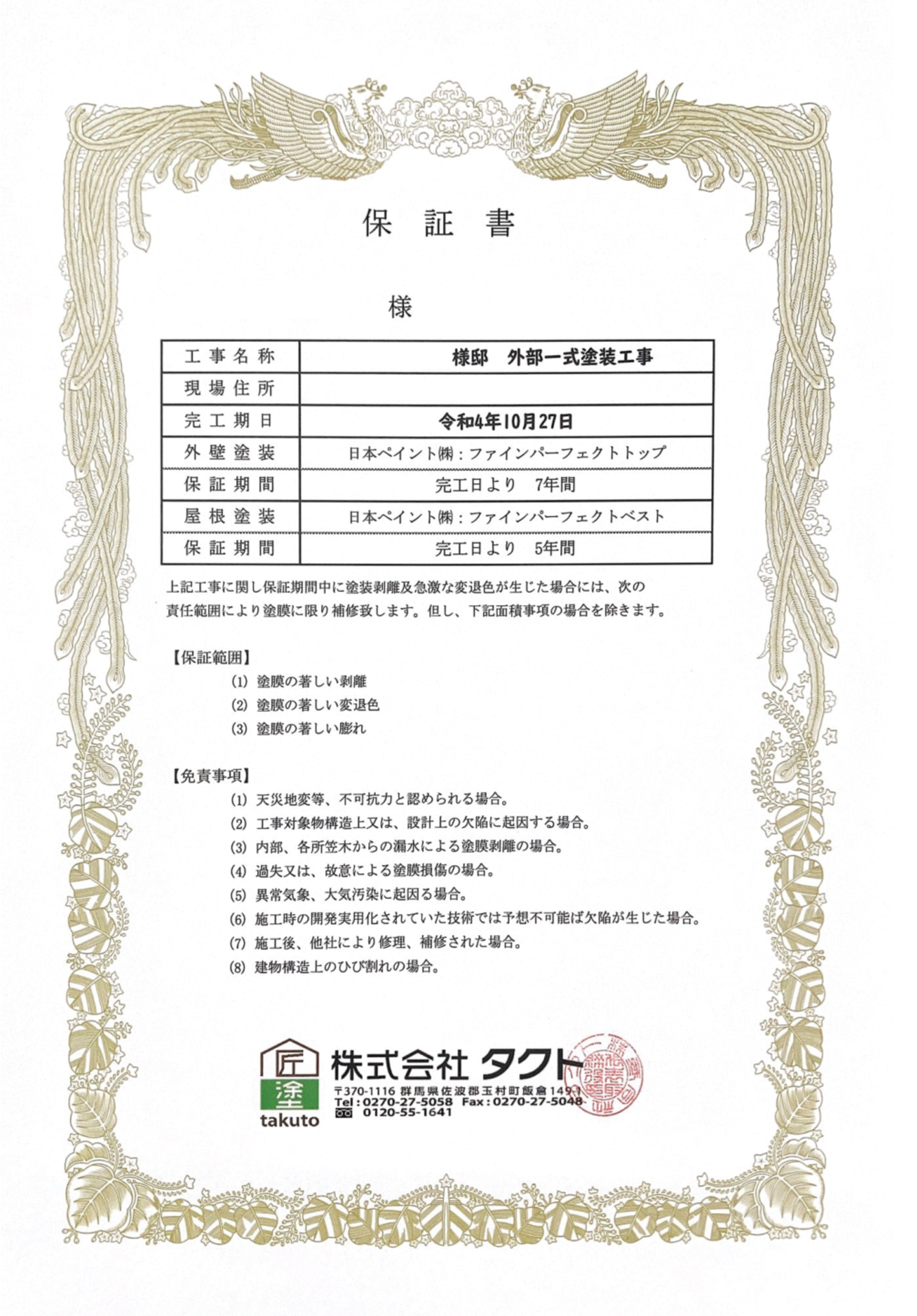 工事保証書発行(5~12年の工事保証)